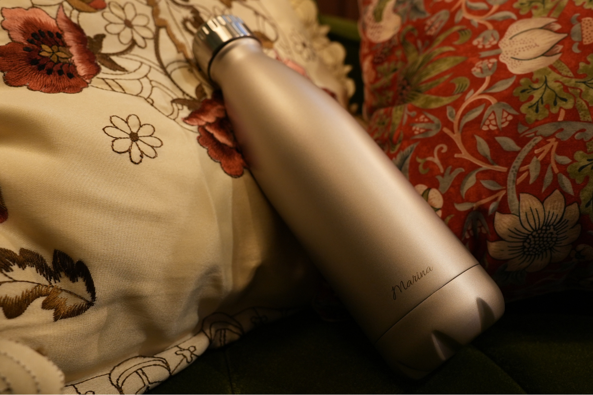 FLSKロゴの180度反対側に刻印いたします。文字サイズは刻印する文字数に応じて調整させていただきます。文字数が多くなるほど文字サイズは小さくなります。